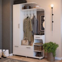 Представляет собой небольшую, компактную и функциональную прихожую. Она состоит из двух модулей – вешалки с крючками и тумбы-банкетки. Последняя включает в себя три полочки для различных вещей, ящика и мягкого сидения. Выпускается прихожая в двух цветах: корпус – ясень шимо светлый или ясень шимо темный, мягкий элемент – ткань и винилискожа серого цвета.